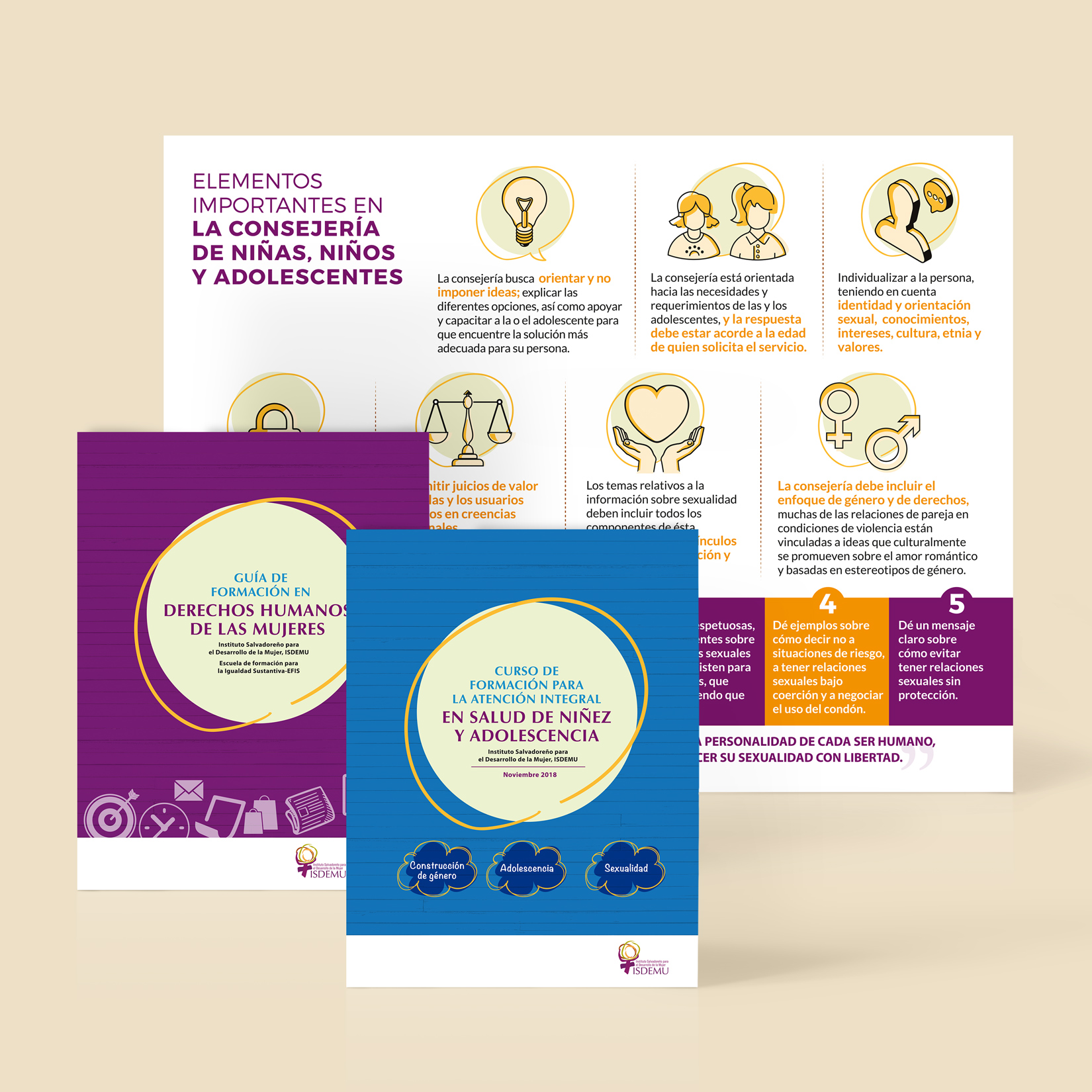 Fondo de Población de las Naciones Unidas (UNFPA)/Instituto Slavadoreño para el desarrollo de la mujer (ISDEMU). Diseño de infográfico / Diseño y diagramación de guías para talleres de formación: Derechos humanos de las mujeres / Atención integral en salud de niñez y adolescencia